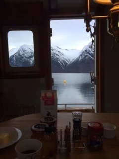 I have been cooking on an old Swedish Navy boat which cruises down Hirenfjord in Norway, accommodating up to ten guests, three crew and two skiing guides. The boat makes several stops during its week-long cruise: guests are taken on guided ski tours in the mountains, before returning to the boat for supper and sleep.